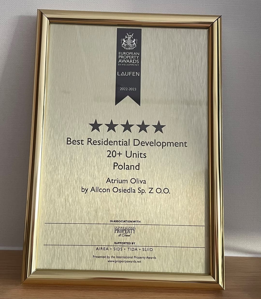 Przypomnijmy, że to nie pierwsze wyróżnienie dla Atrium Oliva. Innowacyjny, wyróżniający się na rynku projekt zdobył uznanie zarówno klientów Allconu, jak i międzynarodowych ekspertów nieruchomości oraz społeczności Trójmiasta. Atrium Oliva jest pierwszą inwestycją w Trójmieście, która otrzymała certyfikat BREEAM Final w kategorii New Construction: Residential, z wynikiem plasującym się na 3 miejscu w Polsce w swojej kategorii. Apartamenty w gdańskiej Oliwie zostały ponadto nagrodzone w konkursie European Property Awards 2022-2023, gdzie zdobyły dodatkowe wyróżnienie FIVE STAR. Projekt doceniono również lokalnie – został wybrany najciekawszą inwestycją mieszkaniową w plebiscycie organizowanym przez portal Trojmiasto.pl.
