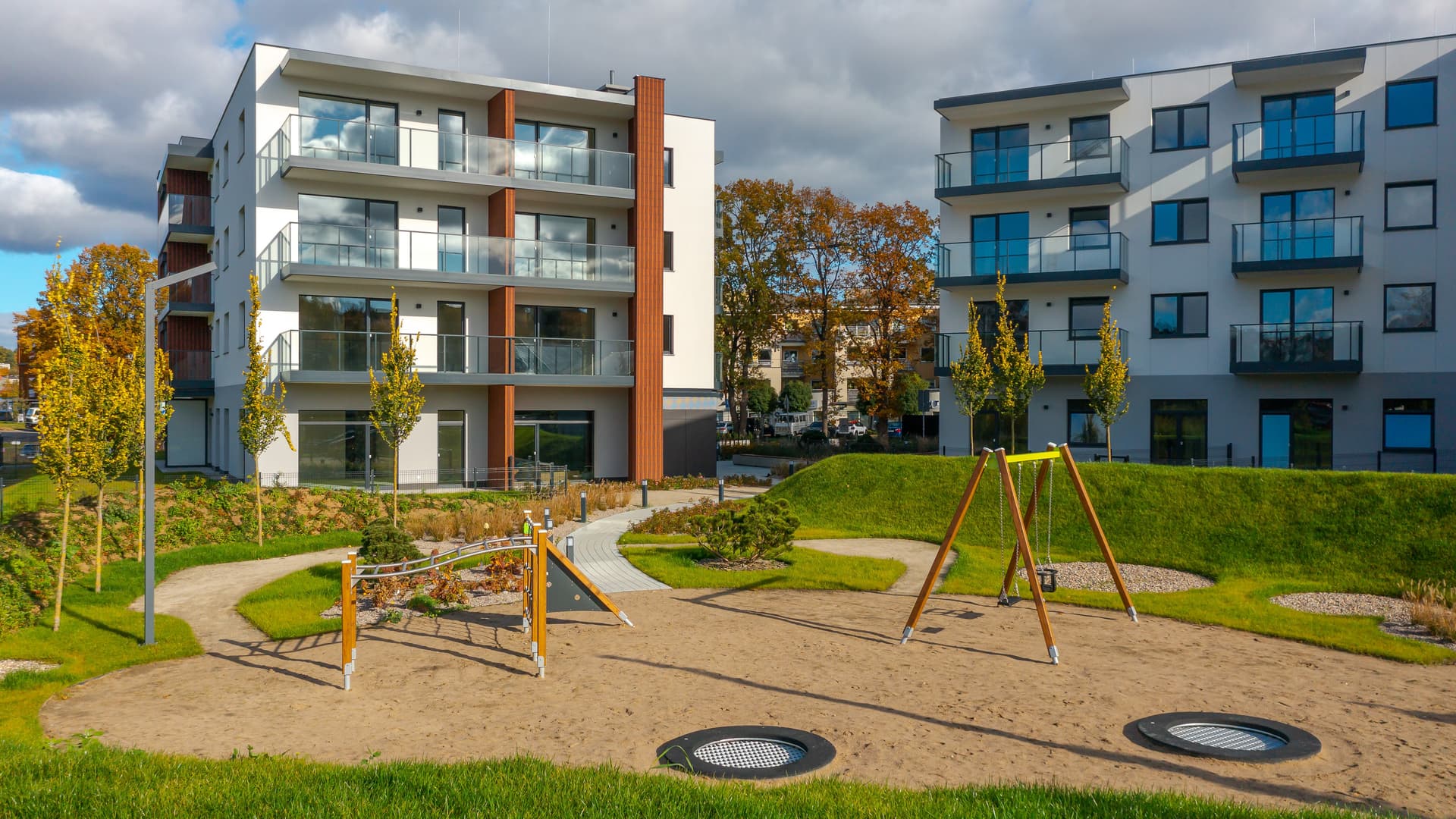 Kameralna zabudowa, spójna architektura i bliskość natury tworzą przyjazną, uporządkowaną przestrzeń do życia – w równowadze między codziennym komfortem a otoczeniem zieleni.