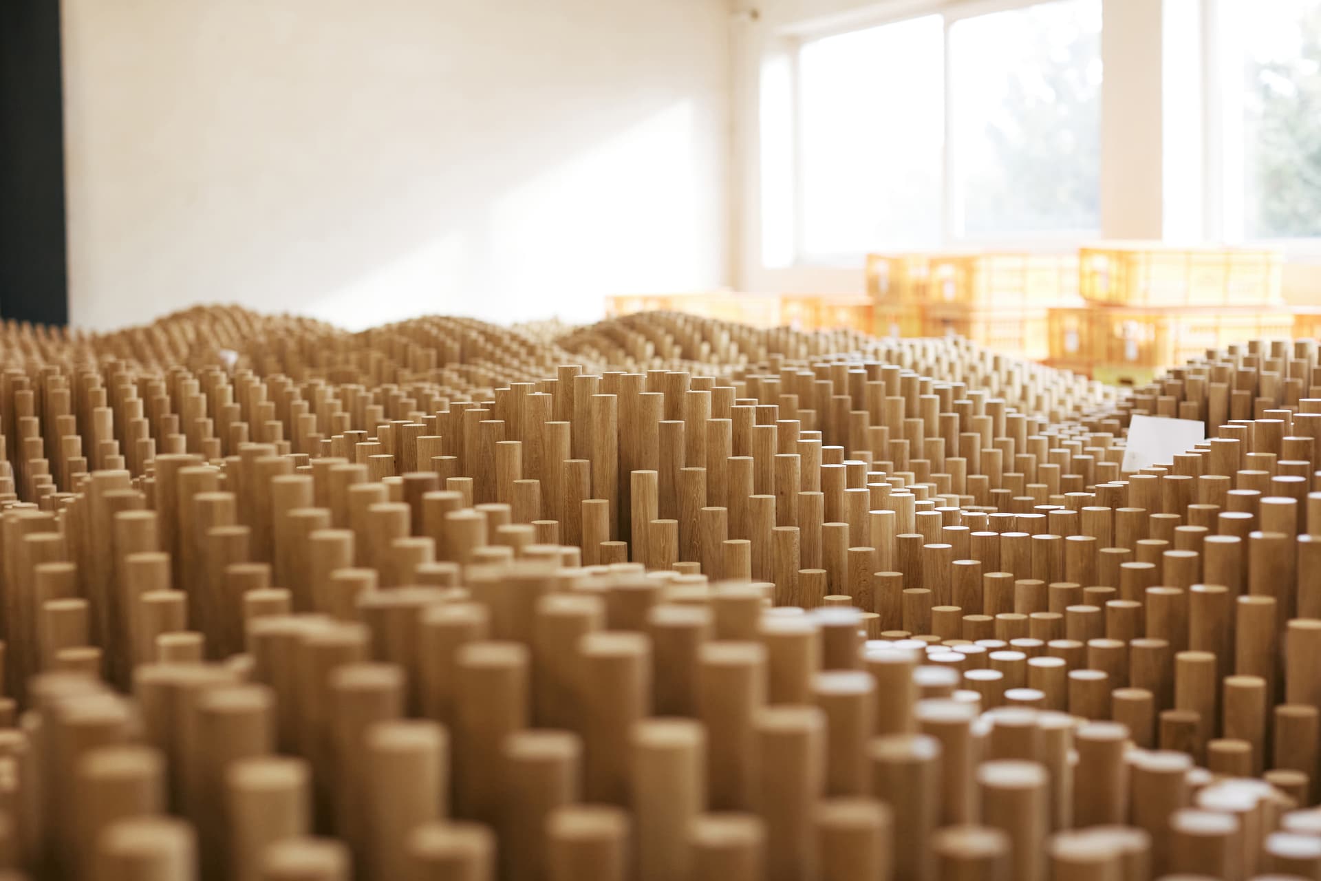 Inspirowana dynamiką morza instalacja sufitowa składa się z 10 850 ręcznie szlifowanych dębowych elementów o łącznej długości ponad 2,5 km. Jego produkcja trwała kilka miesięcy i była realizowana w lokalnej stolarni.