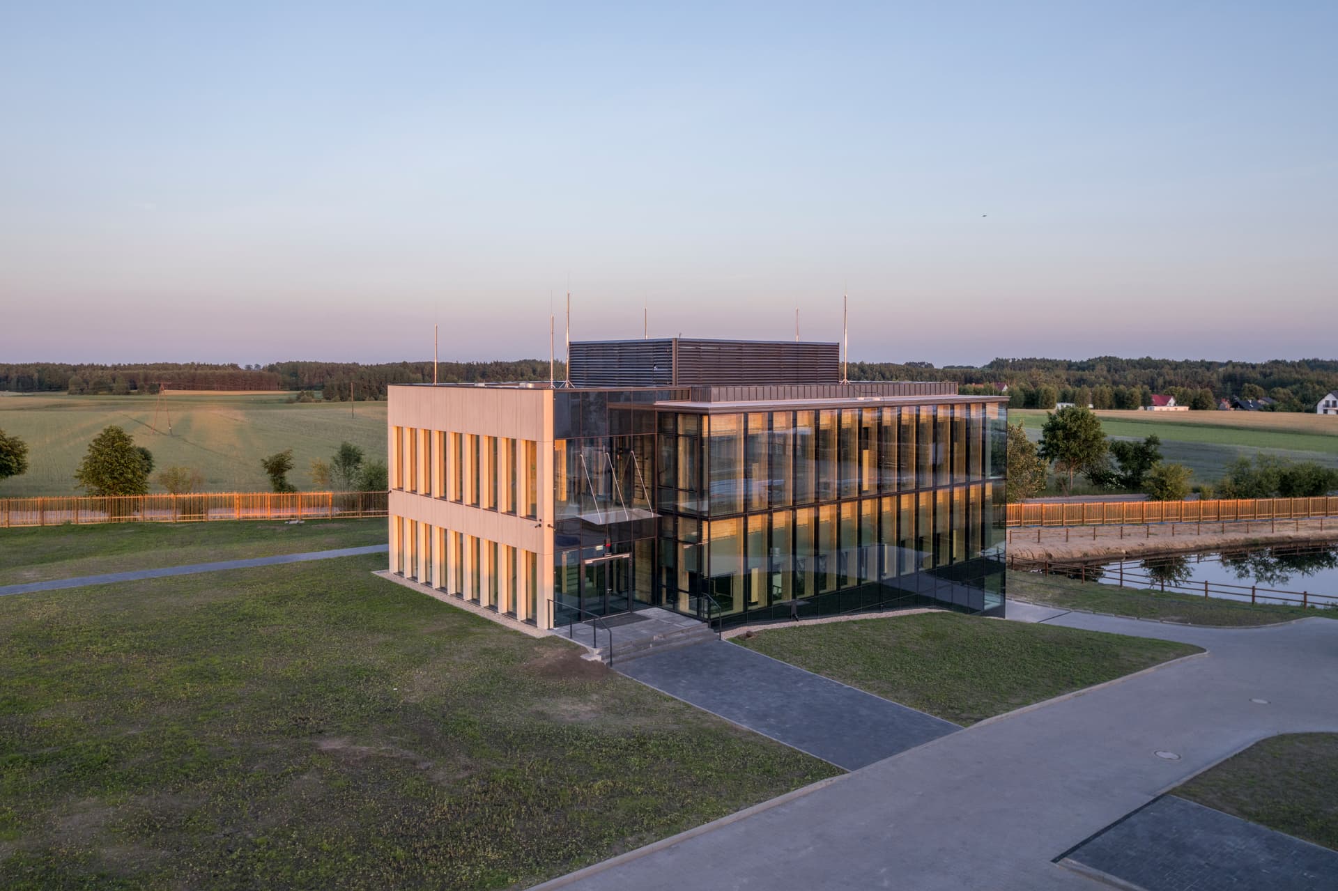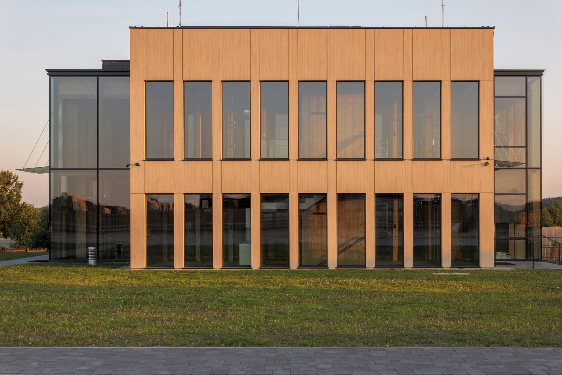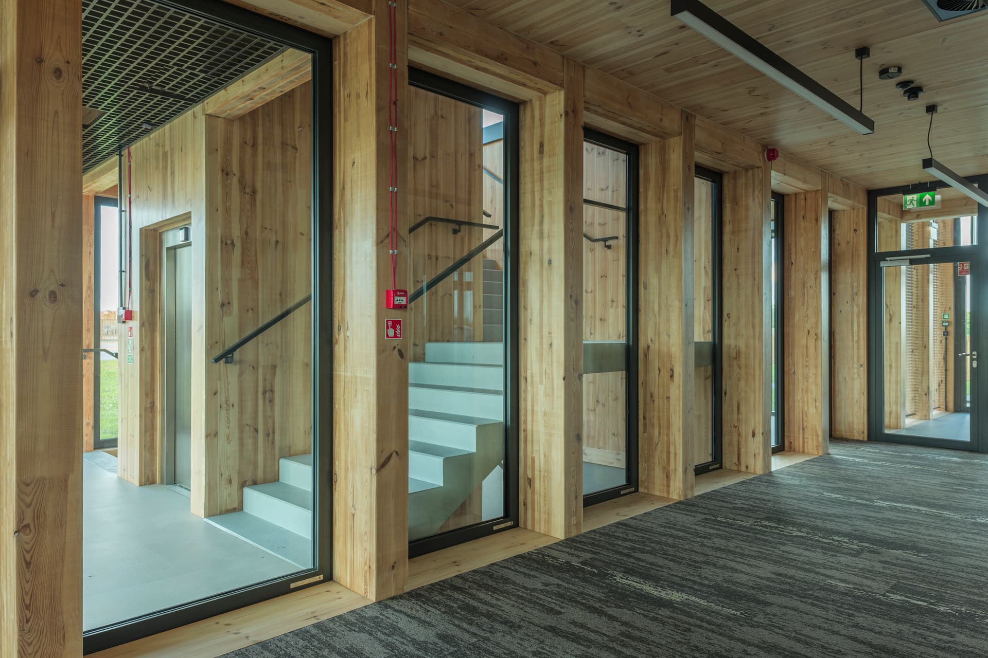 Budynek wyróżnia się przeszkloną fasadą eksponującą drewnianą konstrukcję. Wewnętrzne instalacje techniczne umieszczono pod podniesioną podłogą, pozostawiając odsłonięte stropy drewniane jako element dekoracyjny.