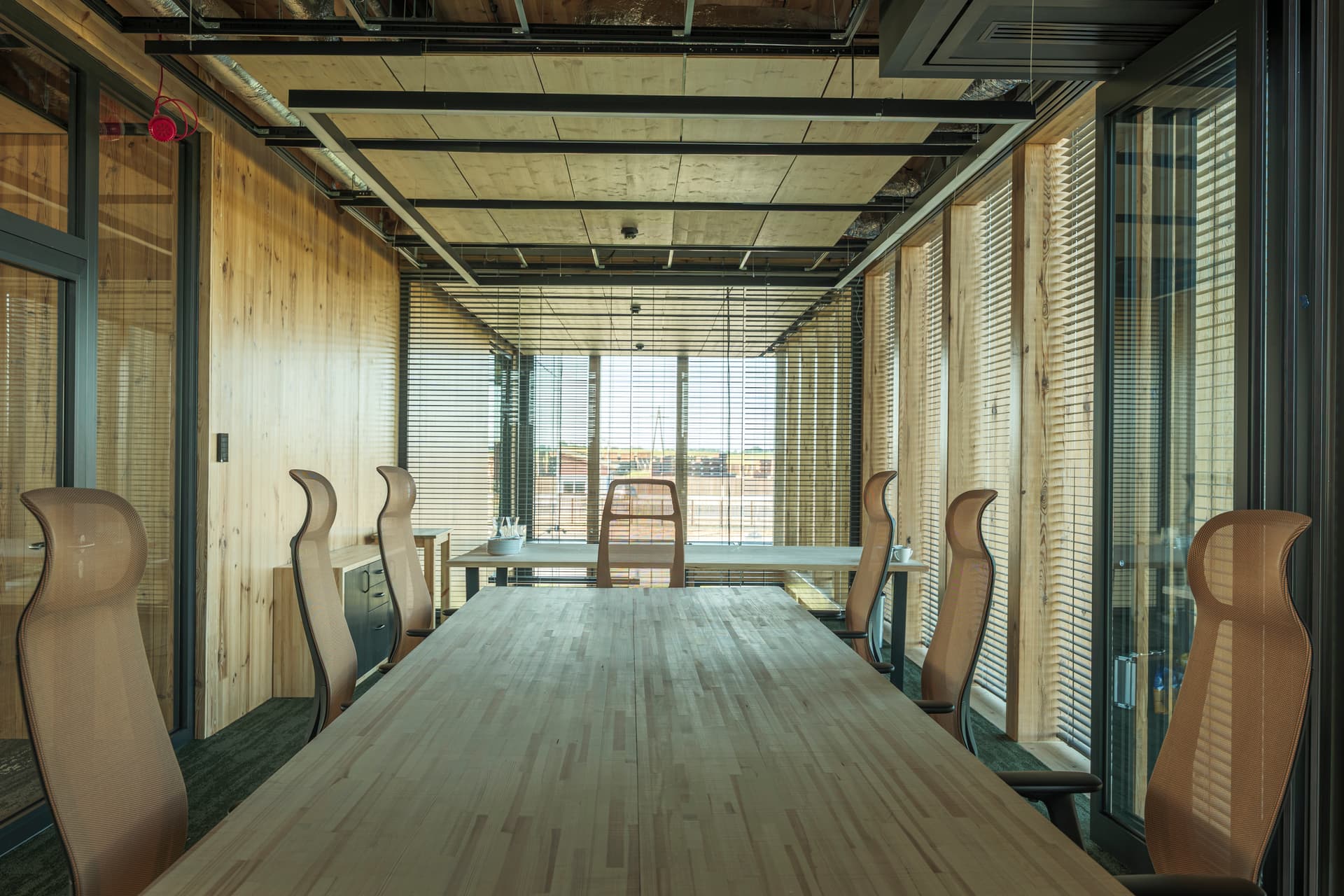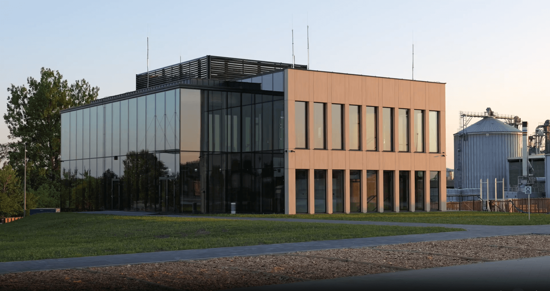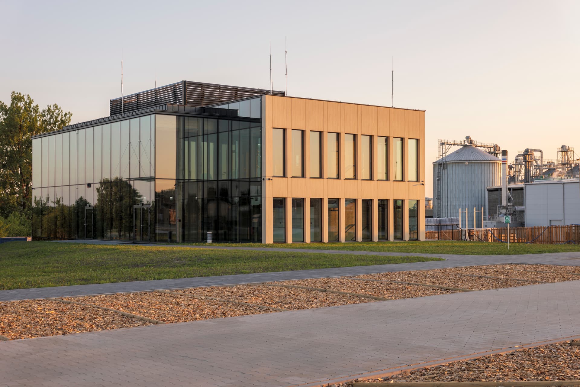 Budynek wyróżnia się przeszkloną fasadą eksponującą drewnianą konstrukcję. Wewnętrzne instalacje techniczne umieszczono pod podniesioną podłogą, pozostawiając odsłonięte stropy drewniane jako element dekoracyjny.
